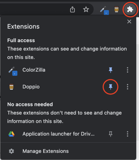 It is recommended you pin the Doppio Chrome Extension to your Chrome window, so you can easily access it. To do this, click the 'puzzle piece' icon in the top right corner of your Google Chrome browser window, and click the pin next to Doppio so it turns blue.